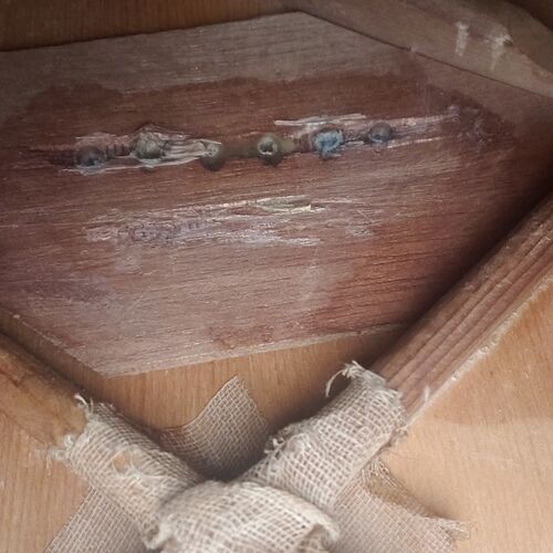 ブレーシング、ブリッジの接着が済んだが、ブリッジ接着時にブリッジプレートのダメージを広げてしまった事もあり補修をした。 ブリッジを自作の治具でブリッジとブリッジプレートを挟みクランプしたんだが、木製治具に養生しなかったのでブリッジピンの穴か…